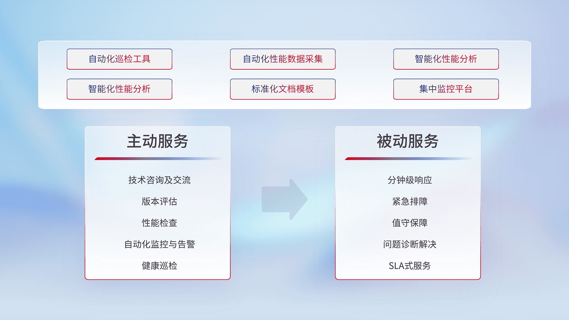 智能化工具和标准化文档,,保障服务质量,,提供主动服务(包含技术咨询、、版本评估、、、性能检查、、自动化监控与告警、、、健康巡检)和被动服务包含(分钟级响应、、紧急排障、、、值守保障、、、问题诊断解决、、SLA服务)。。。。